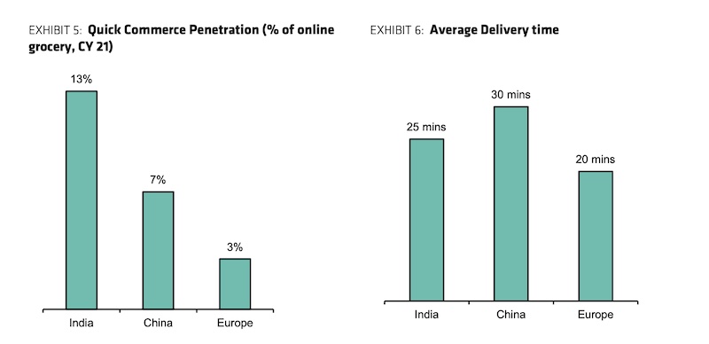 “India is leading other global markets in terms of quick commerce adoption. Quick commerce penetration as a percentage of online grocery is ~13% vs China (~7%), Europe (~3%). Average delivery time in India (~25 mins) comparable with global standards China (~30 mins) & Europe (~20 mins),” analysts at Bernstein said in a report last month.