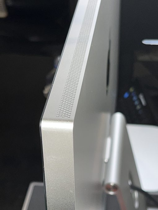 The max peak volume is roughly in the range of the 27” iMac, but with a far richer and broader tonality. The bass response is really impressive for a small chamber speaker array. Even though it’s “small bass,” you still feel it a bit at a distance which adds a little texture. The low end does still have that constrained feeling that is common to small chamber speaker setups, but the midrange is pleasantly broad and not tinny at all.