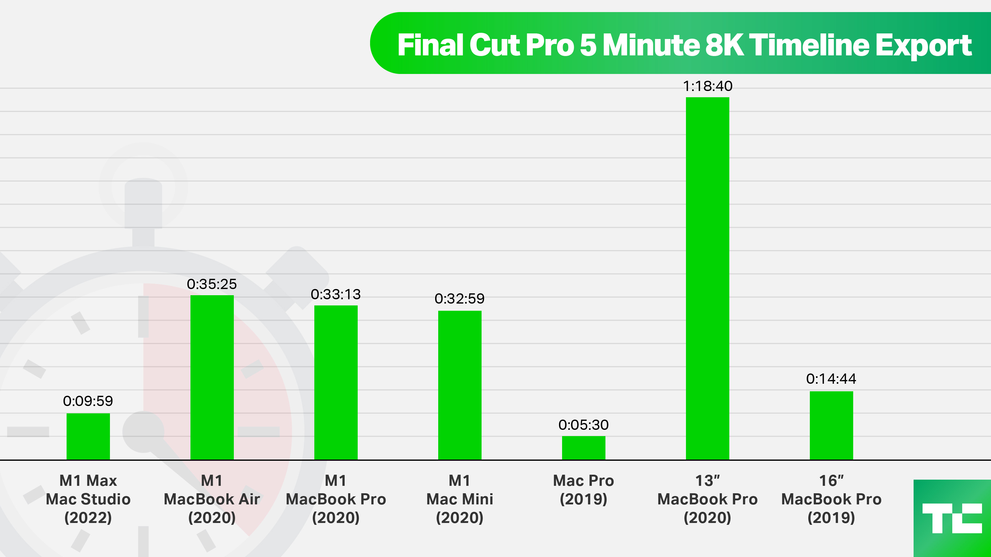 In my testing, to cite one example, the Mac Studio with M1 Max that I am trying out clocked an 8K timeline export from Final Cut Pro that was 3x as fast as the 2020 M1 MacBook and only 3 minutes slower than a near-completely-maxed-out Mac Pro. The Mac Studio as configured will set you back around $3,200. Only around $20,000 cheaper than the Mac Pro I used to perform this test back in 2020.