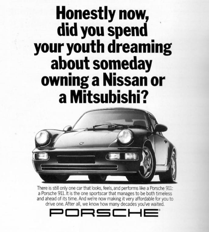 The Mac Pro fell victim to a phenomenon that I think explains a lot of chatter about pricing every time Apple releases a new machine. Much like the classic Porsche print ads of the 80s and 90s, much of Apple’s positioning is about how accessible its products are while simultaneously positioning them as objects of desire to be strived for.