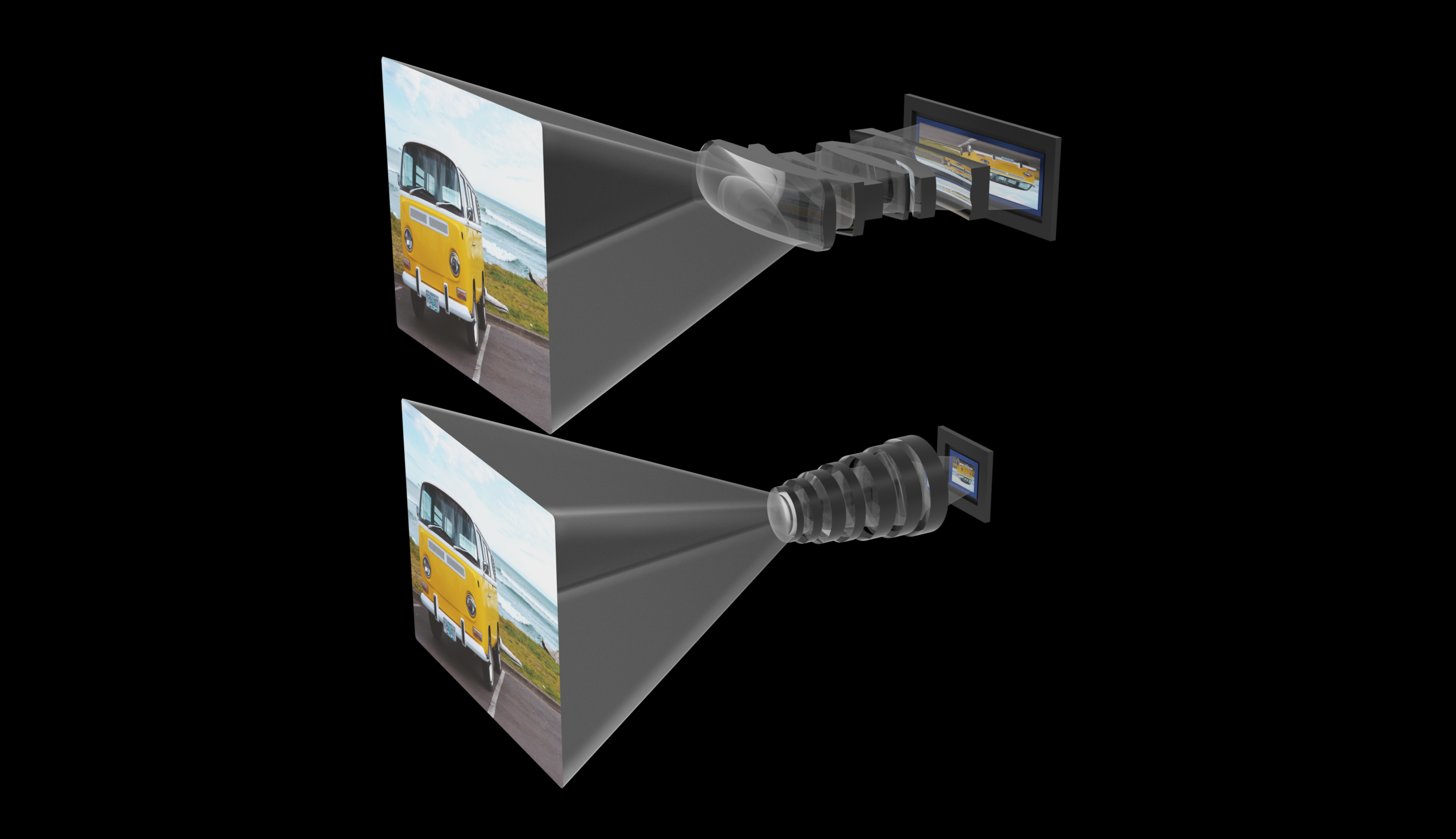 So what is that work, exactly? Attar has decided that of these various conundrums, the only one that makes sense to change is the lens. True, it can’t get any bigger — but only if you’re using a normal, symmetrical lens assembly. But why should we? They gave up on that constraint a century ago in cinema.