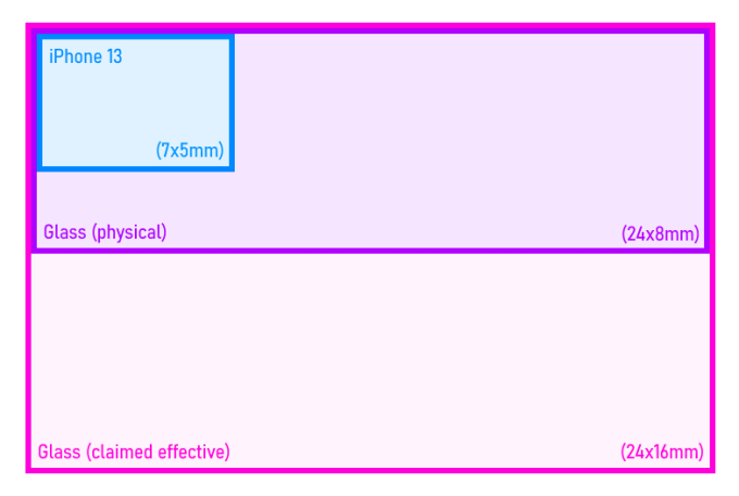 How much larger an image are you able to capture? Well, an iPhone 13’s main camera has a sensor about 7×5 millimeters, so 35 square mm total. Glass’s prototype uses a sensor that’s about 24×8 mm: about 192 square mm, 5-6 times larger, with a commensurate increase to megapixels. Here’s a little chart for casual reference: