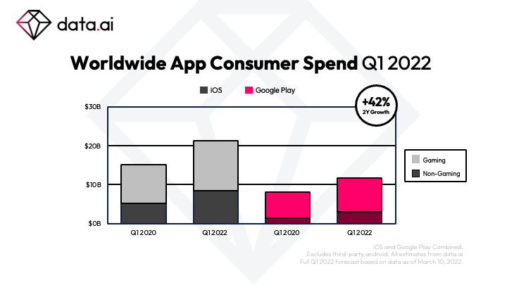 Consumer spending on apps also grew in Q1. The first quarter of the year again proved to be the biggest ever for consumer spending, which reached $33 billion. iOS apps continued to drive the majority of the app ecosystem’s growth on this front, accounting for 65% of the quarter’s total of $33 billion in consumer spending — a figure up 42% over the past two years. The 65% figure is also in line with the previous five quarters, data.ai said.