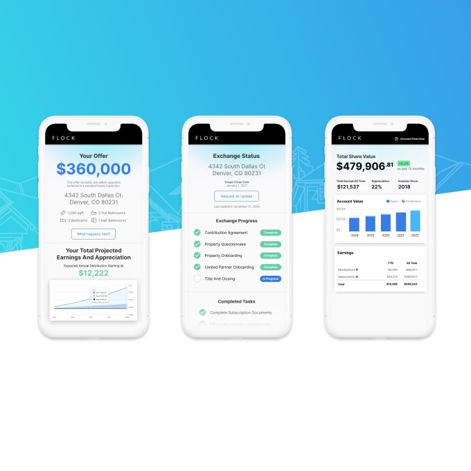 “Flock buys the property from the landlord, who then gets shares in this partnership which owns a bunch of houses,” Rubin explained to TechCrunch. “They get to keep all the benefits of owning real estate without any of the burdens such as paying taxes or maintenance.”