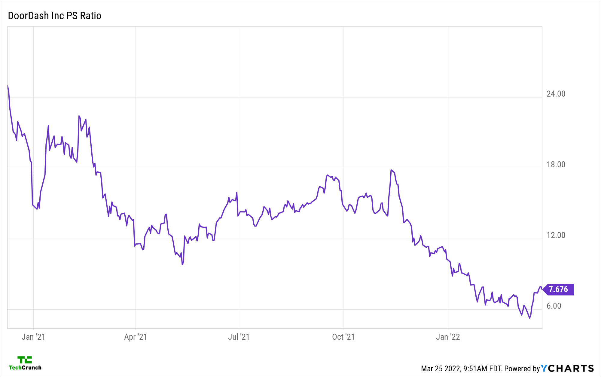 DoorDash, which delivers both prepared foods and grocery items, has also seen its price-sales ratio fall from 2021 highs (via YCharts):