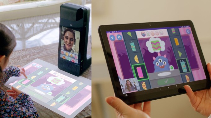 Part video calling device and part projector, it’s meant to connect kids with distant family members in a unique, dual-screen way: one built-in screen for the remote caller’s face, and another beamed onto the table below via a not-so-obvious projector, to act as a big ol’ touchscreen for games and books. Everything the kid sees on their tabletop touchscreen is, generally, mirrored on the remote caller’s iOS/Android tablet; when Mom/Dad/Grandma/Grandpa turns the page a thousand miles away, the kid’s page turns too.