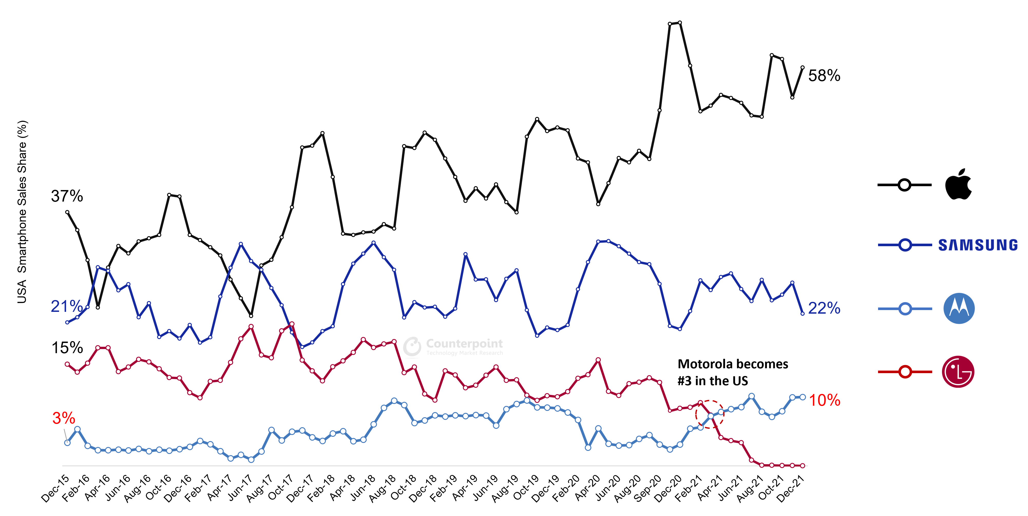 Turns out the smartphone market can still surprise — to an extent. You can almost certainly figure out which two companies command the first and second position in the U.S. market these days. You would, however, be forgiven for doing a double-take after hearing that Motorola has managed to shore up third place, according to new figures from Counterpoint Research.