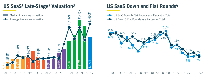 The chart on the left is the dataset we care about. Observe how from Q1 2020 through Q3 2021 the median late-stage valuation for U.S.-based SaaS startups — a large fraction of the aggregate domestic and international startup cohort — went up every single quarter, peaking at $367 million on a pre-money basis.