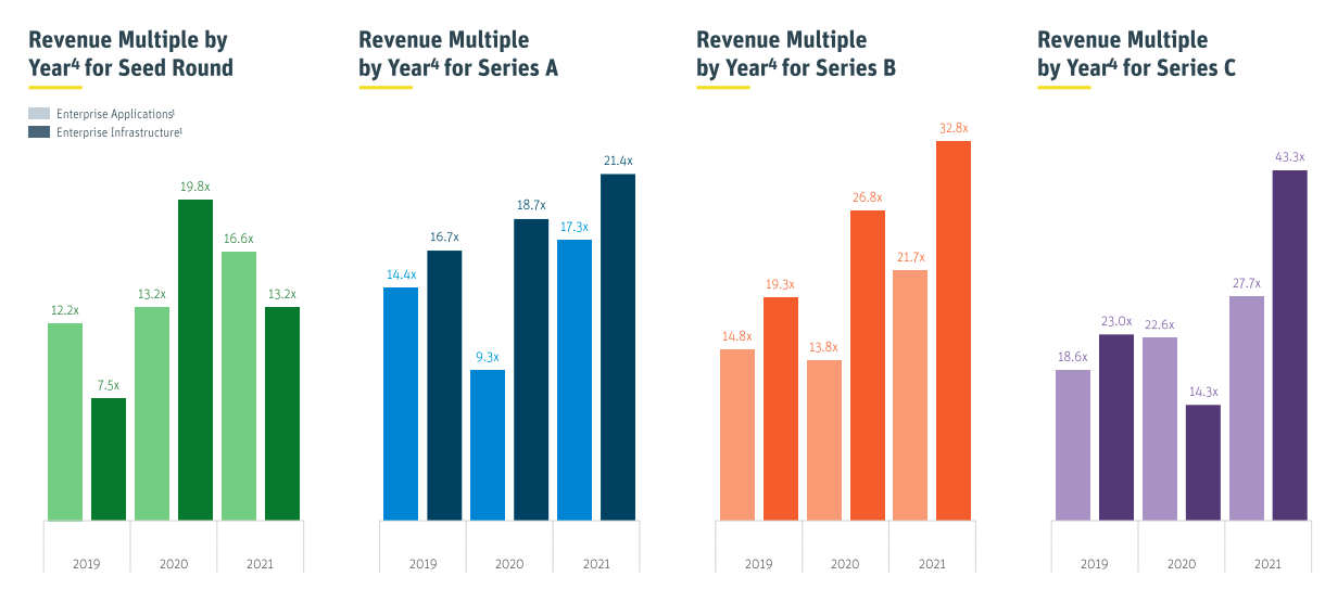 From Series A through C, there’s a clear trend of rising multiples. In 2021, for example, SaaS startups building enterprise applications were worth 17.3x revenues at Series A, 21.7x at Series B, and 27.7x at Series C. For enterprise infra startups, the SaaS multiples awarded in 2021 were even steeper, coming at 21.4x for Series A, 32.8x for Series B, and 43.3x for Series C.