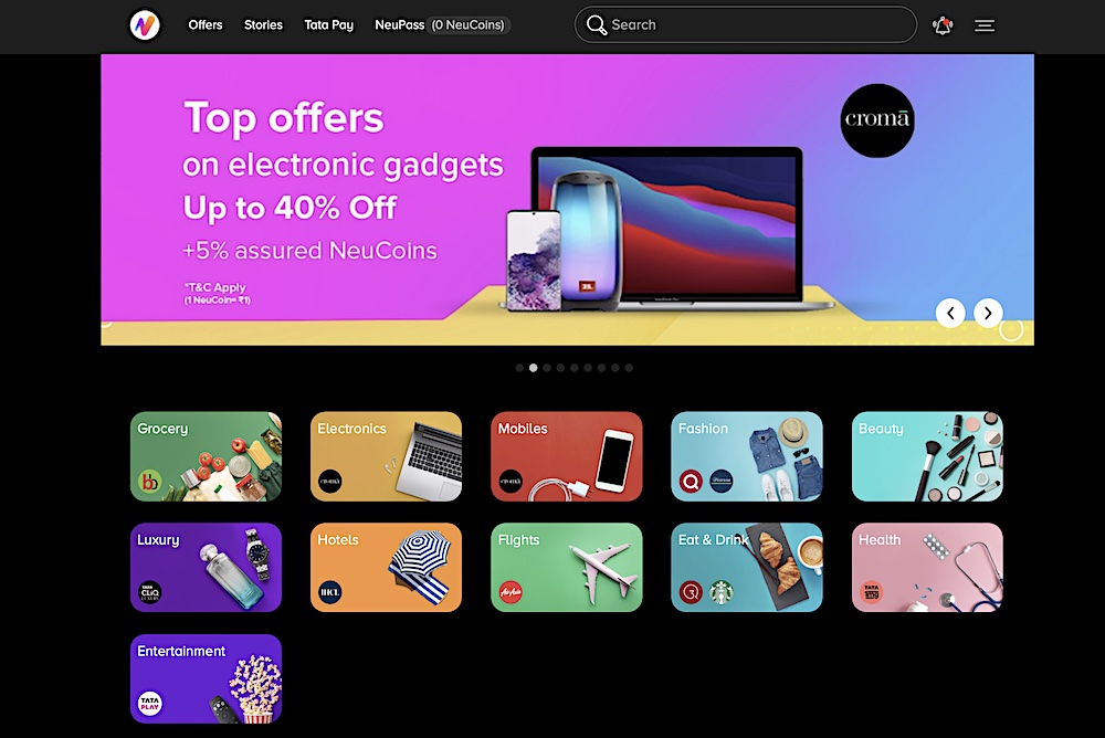 Tata Neu packs nearly a dozen properties that are either owned by Tata Group or in which it has a significant stake. The services include online grocer BigBasket, electronics store Croma, pharmacy service 1mg, luxury brand Cliq, streaming app Tata Play, as well as ticketing with AirAsia and food and beverages with the coffee chain Starbucks. The app also debuts Tata Pay, the giant’s UPI-enabled payments service that also offers loans and insurance.