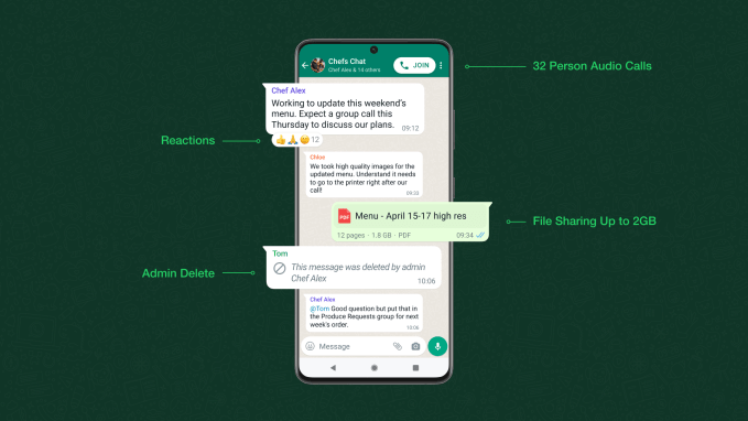 Meta is throwing billions of dollars into building out the metaverse as the future of social networking, but in the near term, the tech giant is looking toward the power of messaging to connect users in a more personal way. On that front, the company today introduced its plans for a significant update to its WhatsApp messaging app that will allow users to now not only connect privately with friends and family, as before, but also participate in larger discussion groups, called Communities. These groups aim to serve as a more feature-rich replacement for people’s larger group chats with added support for tools like file sharing, 32-person group calls and emoji reactions, as well as admin tools and moderation controls, among other things.