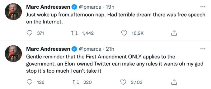 Musk tweets incessantly, and to apparently no censorship. (Is this all about bringing Trump back to Twitter? Recall that the former president is also banned from Facebook, where Andreessen currently works part time.)