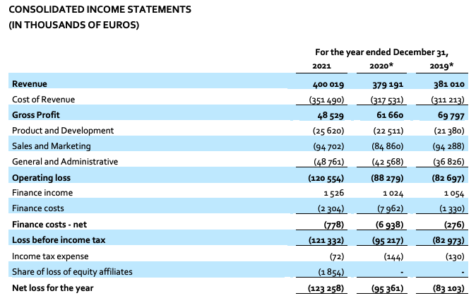 A few things jump out at once, including slow revenue growth in 2021 and negative historical growth in 2020. The company has also posted decreasing gross profit results — and falling gross margins — in recent years. Those declines are contrasted against rising sales and marketing costs, leaving the company with stiff — and growing — deficits.