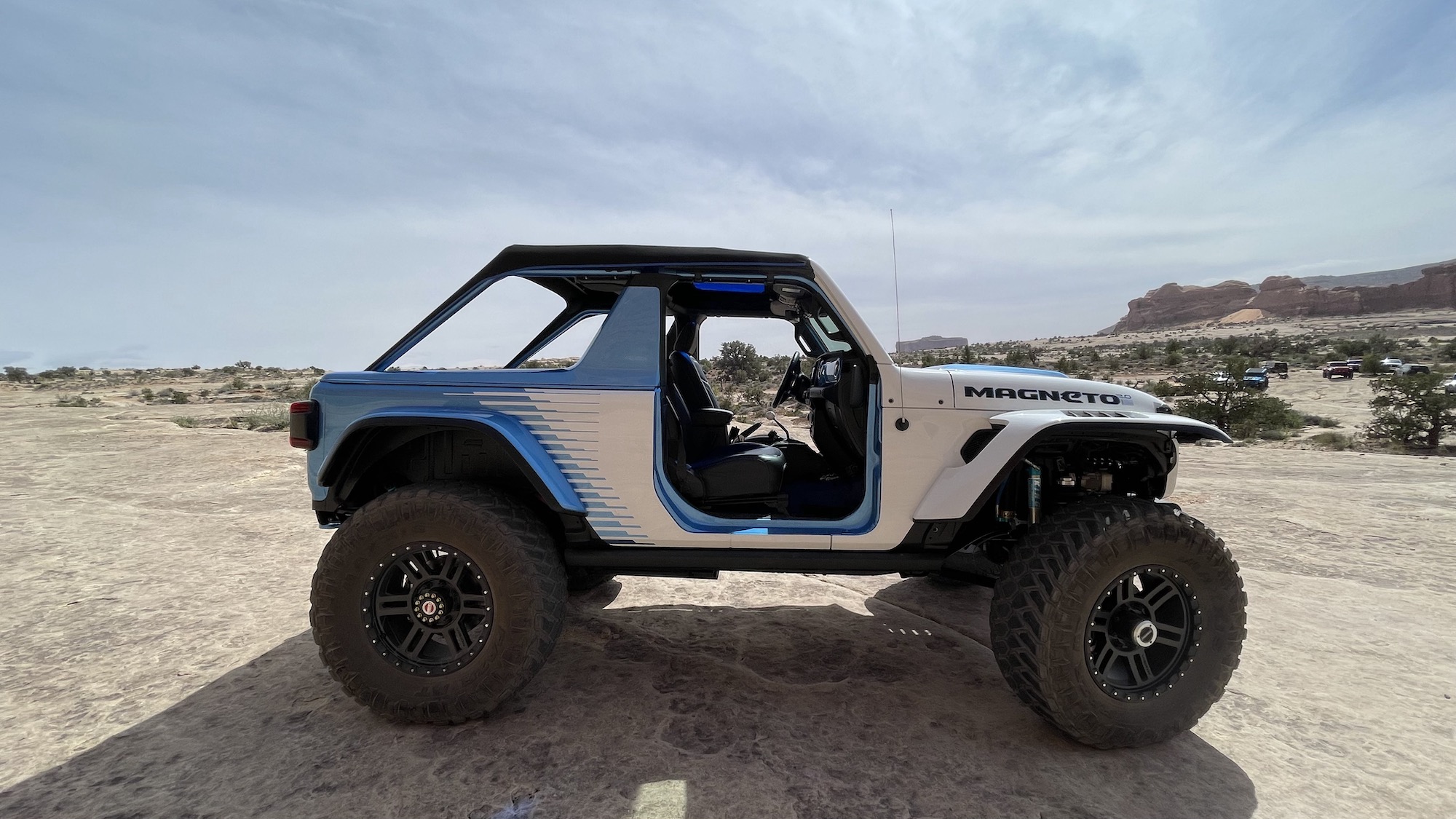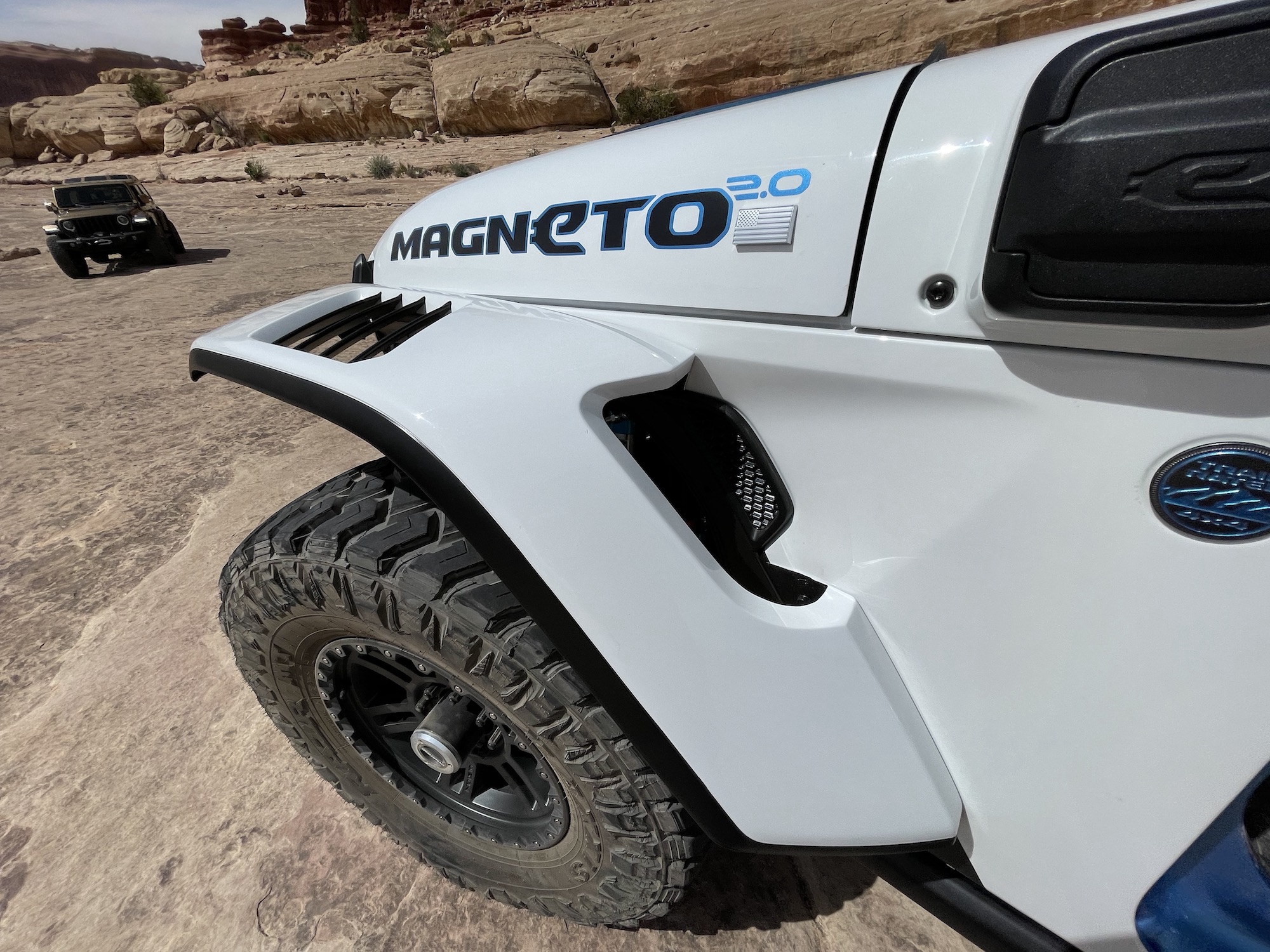 Notably, the Jeep Wrangler Magneto concept 2.0 has a six-speed manual transmission and a propulsion system that can maintain a peak amperage of 600 A for 10 seconds. The end result is a system that can deliver 850 pound-feet (1,152 Nm) of torque to the wheels and travel from 0 to 60 miles per hour in twp seconds.