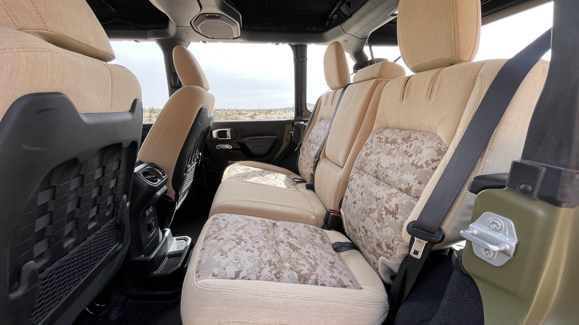 There’s even a customized shifter cap. Inside, there are canvas-covered seats with digital camo inserts to finish off the military look.