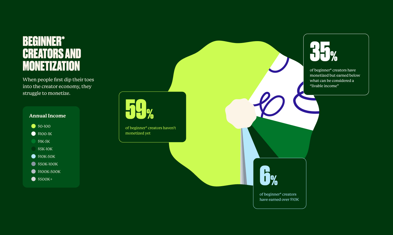 Linktree estimates that 66% of creators see their online pursuits as a side hustle, while 36% of creators have only been making content for a year or less. Of those creators, whom Linktree classifies as “beginners,” only 6% have earned over $10,000. Thirty-five percent have monetized, but haven’t earned enough to make a “livable income,” while 59% haven’t monetized yet.