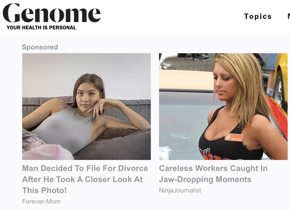 “We built this beautiful media company with award-winning content and a great magazine. We invested a lot … a website that resonated with folks, and we had a quarterly magazine, so we also put a lot of original content on the site. The site was ranking really high on Google,” explained Susan McClure, founder and publisher of Genome Magazine. “The content was still there. And then we discovered these ads on there that we never would have allowed. When I visited our site recently to revisit a story we had published about privacy protections around our DNA and the identifiable information contained within it, I was shocked to see ads about infidelity and toenail fungus.”