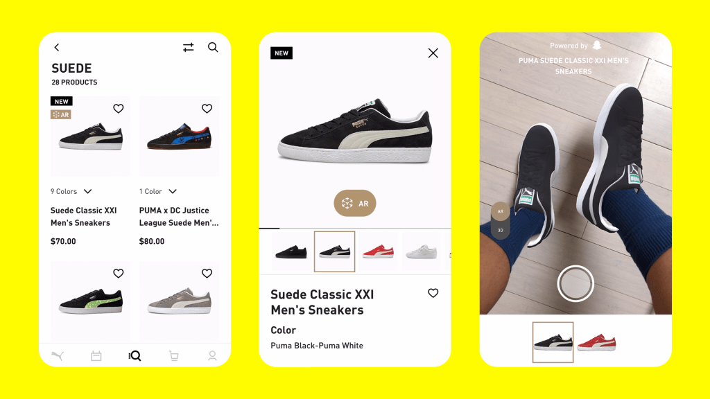 Its first global partner to use the technology is Puma, which will allow shoppers to virtually try on its sneakers using the Camera Kit integration. Shoppers would simply point their phone at their feet to see the sneakers they’re considering appear in an AR view.