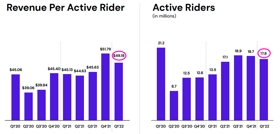 Still, Lyft’s business has improved off of deep COVID lows. In Q1, for example, Lyft saw its active rider count reach 17.8 million, up nearly 32% from its year-ago result of 13.5 million. And those riders are spending more than they did at the start of 2021, with Lyft’s “revenue per active rider” metric rising to $49.18 in Q1 2022 compared to $45.13 in the year-ago period; the more recent number is some 9% greater than its comparative 2021 result.
