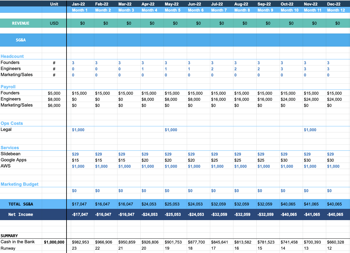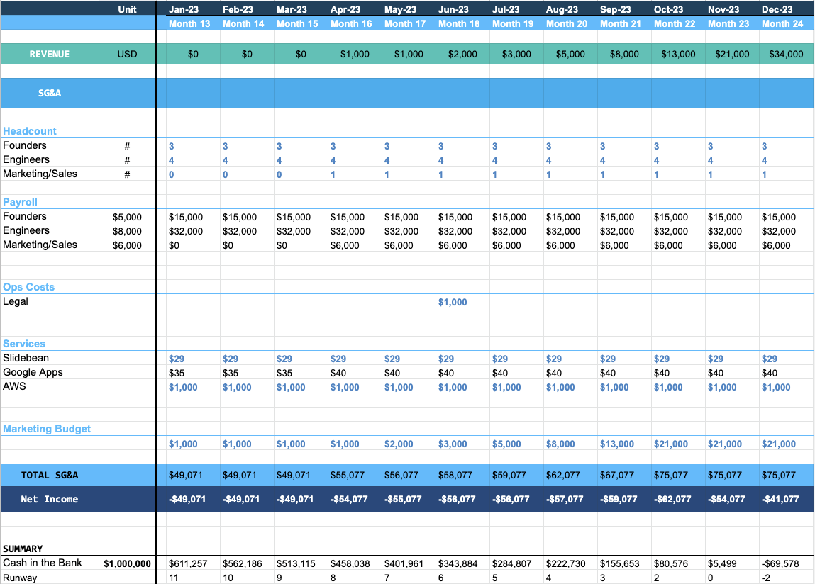 In our scenario, this company will be approaching fundraising with $2,000/month in revenue and an operating cost of $55,000+, which might not be enough to get the next round of investors excited.