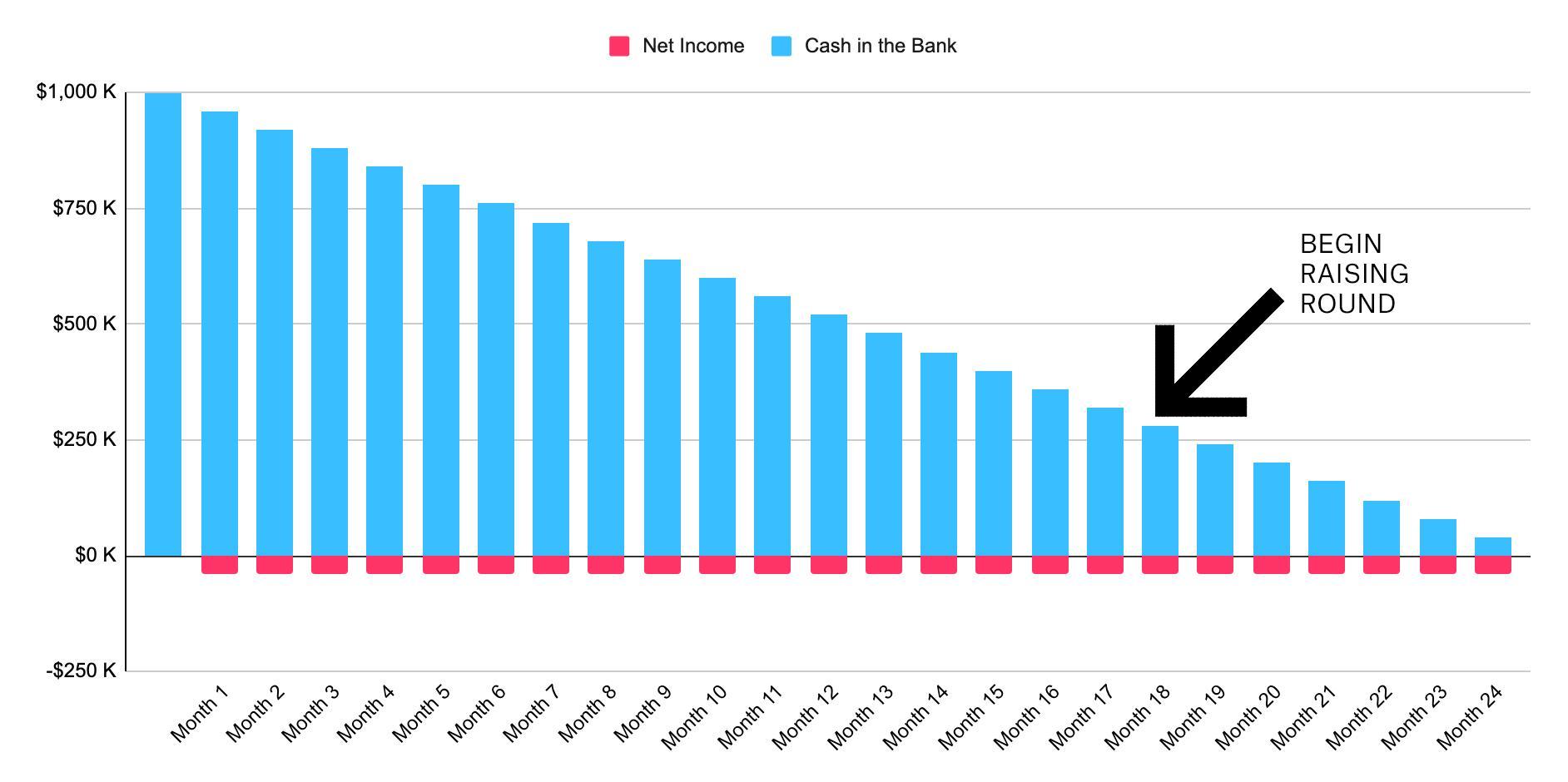 In this scenario, for example, the company is bound to run out of capital by November 2023, which means they ought to start raising capital around May or June.