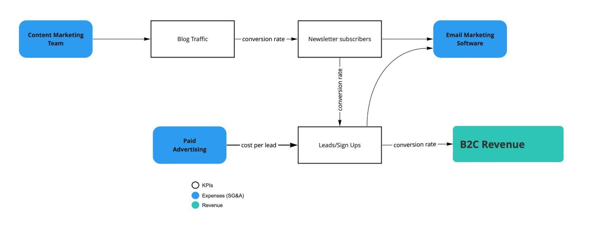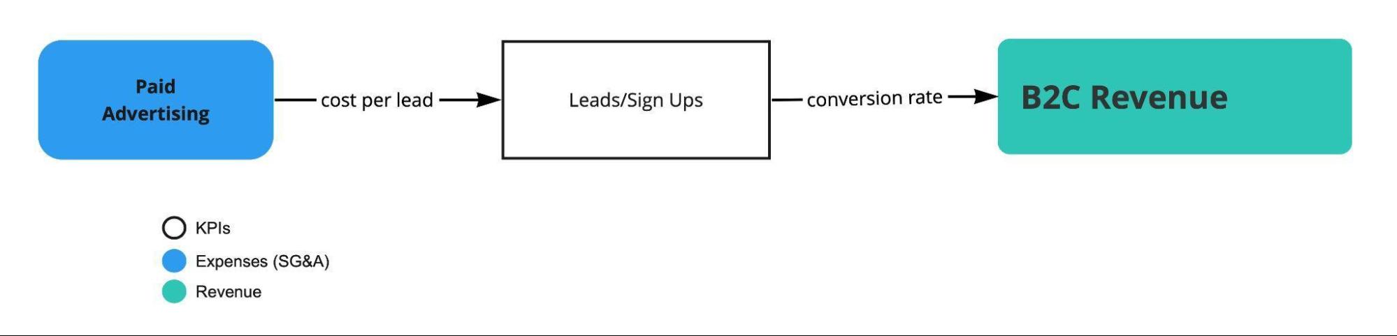 In a B2C SaaS business that plans to grow via search ads, for example, you would build the model using the paid advertising budget as a driver. That “paid advertising” budget is an expense. That budget is then converted into leads or sign-ups at a cost per click. Likewise, those leads are converted into paid customers at a given conversion rate.