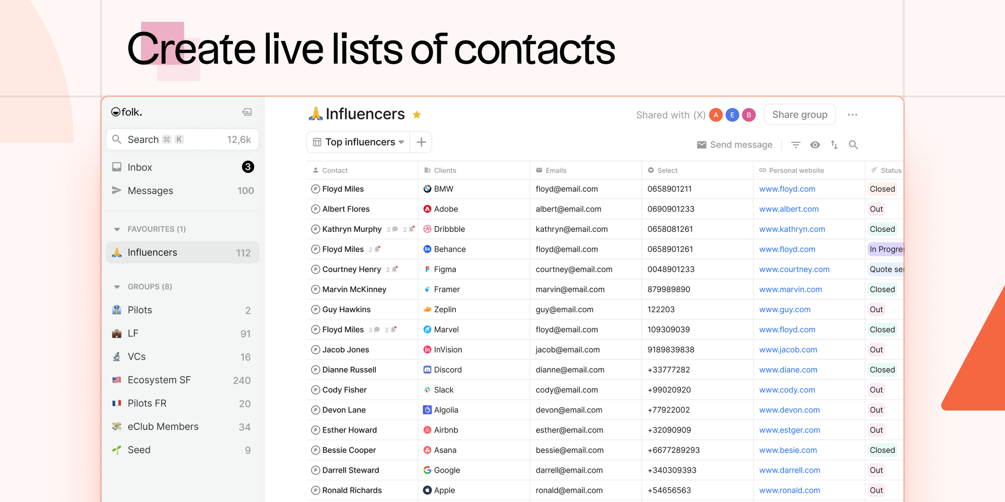 Folk lets you create groups to organize your contacts. Each group can represent a project or a specific group of people. For instance, you can create a group for PR, another one for your existing investors, another one for potential clients, etc.