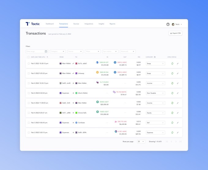 Tactic says it is tackling the problem of accounting for a business’s cryptocurrency holdings and on-chain activity by aggregating data across disparate sources to give businesses “a full treasury view of their balances and activities.” Its software, Jaskiw said, helps companies automatically categorize transactions and apply accounting logic such as calculating $USD gain/loss and taxable events. Accountants can then reconcile a business’s crypto-subledger to traditional accounting software like QuickBooks.
