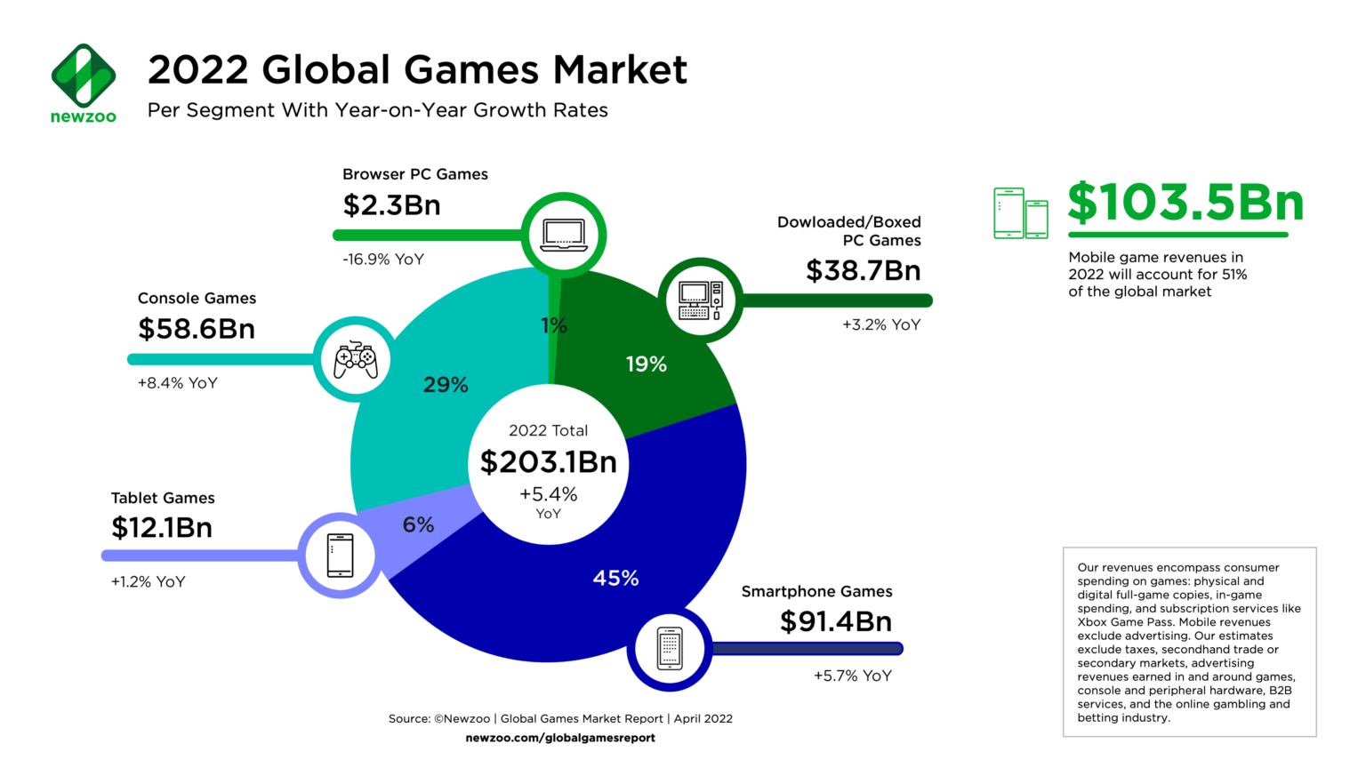 - Games market revenues will surpass $200 billion for the first time in 2022 as the U.S. overtakes China, per a new report from Newzoo. Games in 2022 will reach $203.1 billion via consumer spending (+5.4% year on year) — a new record. Mobile game revenues will pass the $100 billion mark for the first time in 2022, growing +5.1% year over year to $103.5 billion.