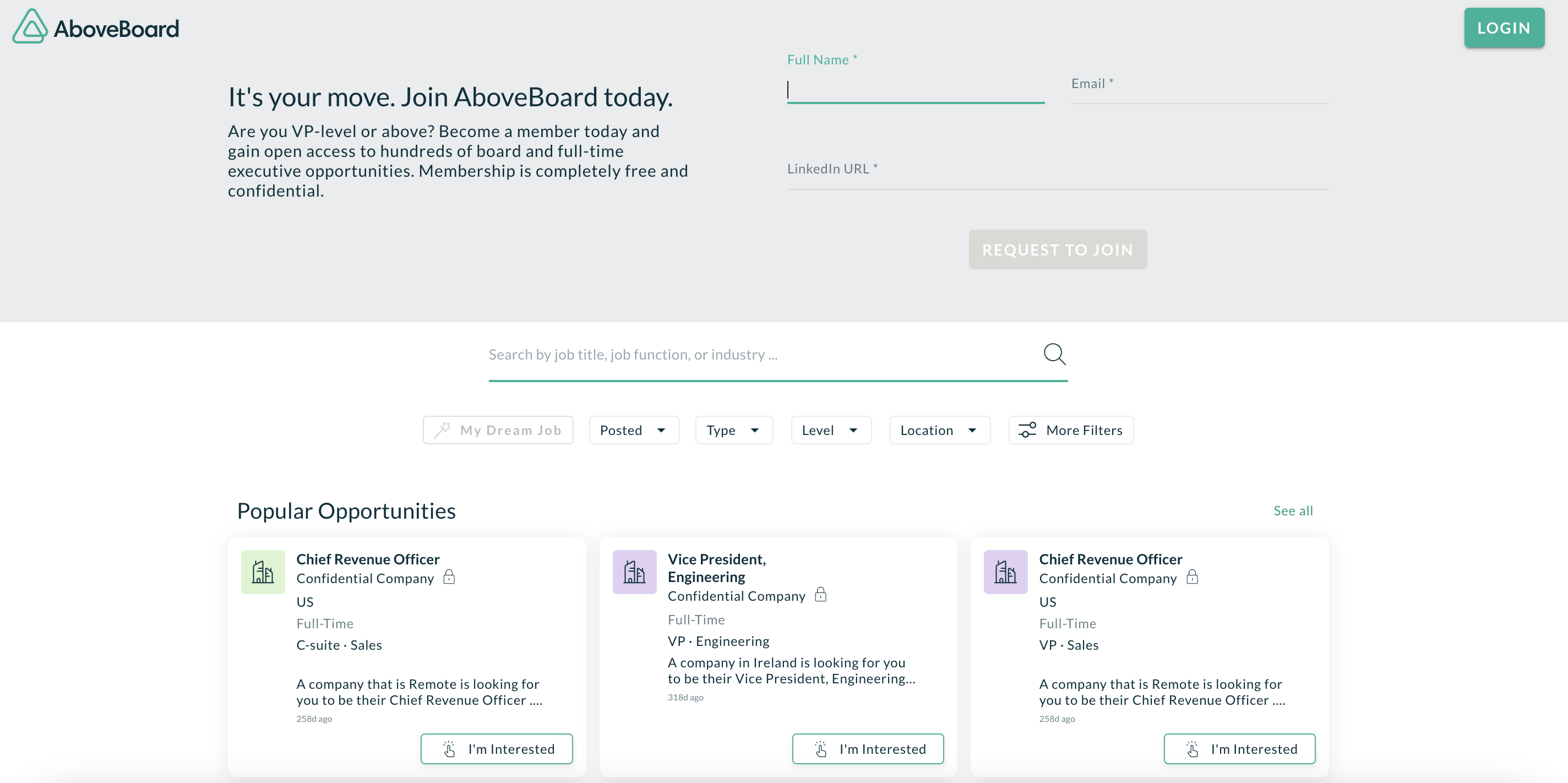 The traditional executive hiring world is built in two main strategies: word of mouth or expensive headhunters. AboveBoard aims to tweak that by creating a two-sided marketplace in which employers can post job listings on a platform that they know has a diverse set of candidates.