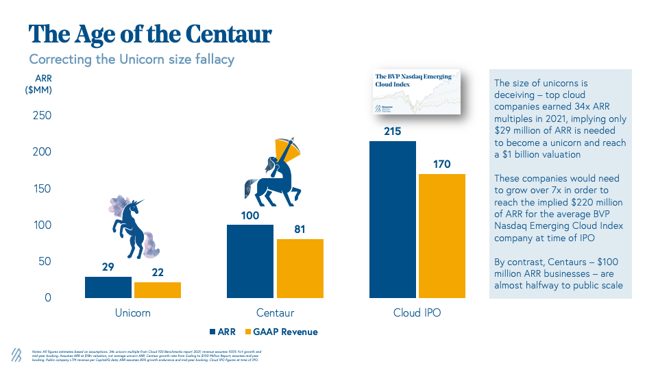 With an estimated 150 private cloud centaurs in the world, these businesses are truly rare. But in naming this new creature “centaur,” we are also indicating that $100 million ARR is the north star entrepreneurs and investors should align themselves with.
