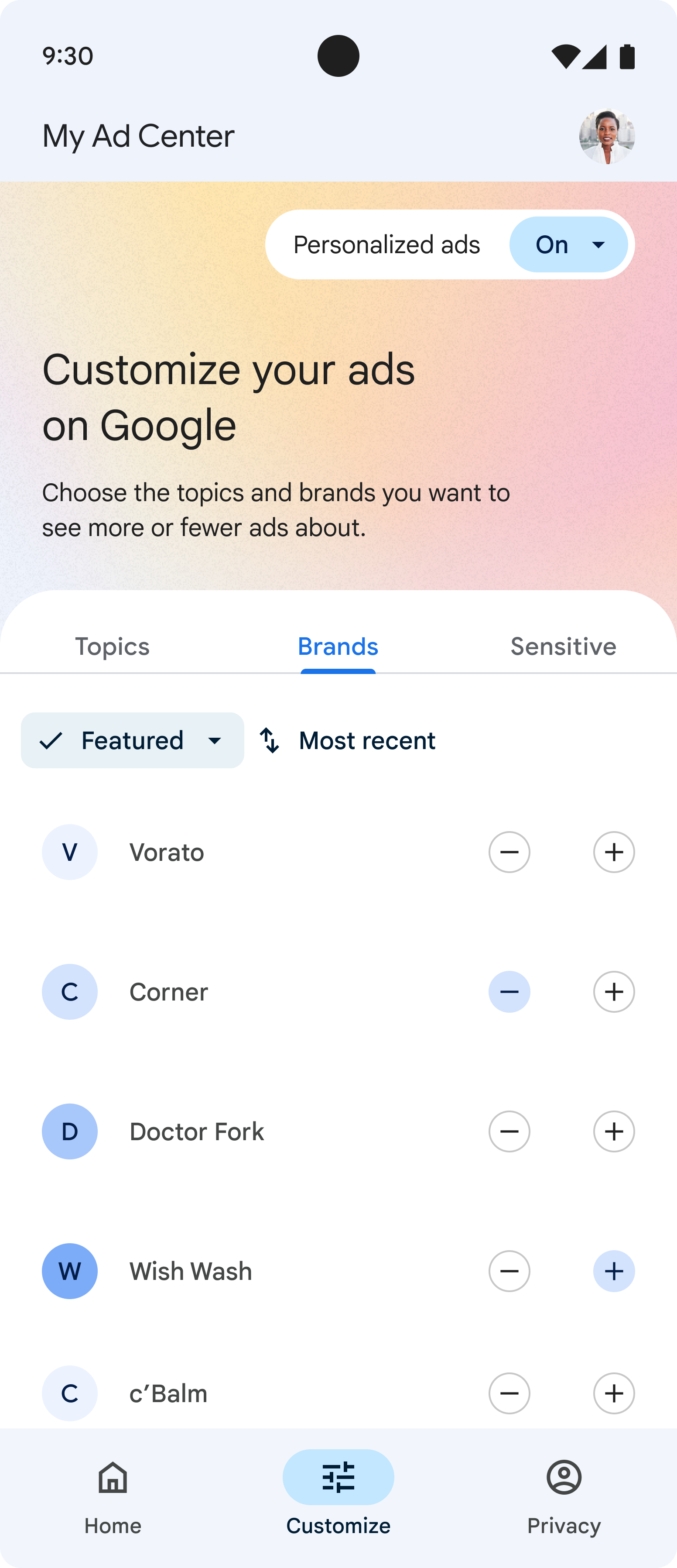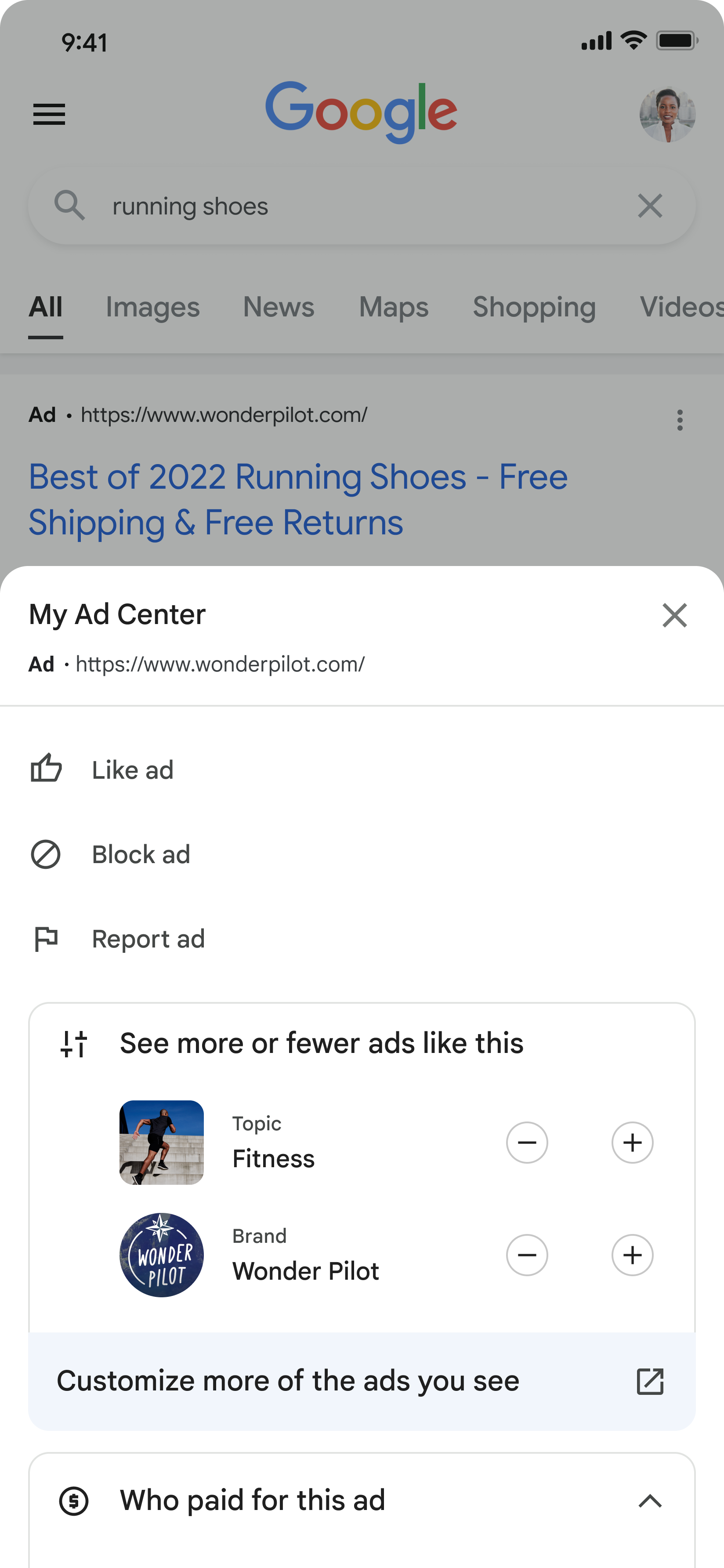 And if users don’t want to see ads of that kind, they can use embedded tools from this menu or visit the new My Ad Center hub to inform Google of that preference. To get to the hub, users just have to click the menu option that says “customize more of the ads you see” to be directed to the new experience.