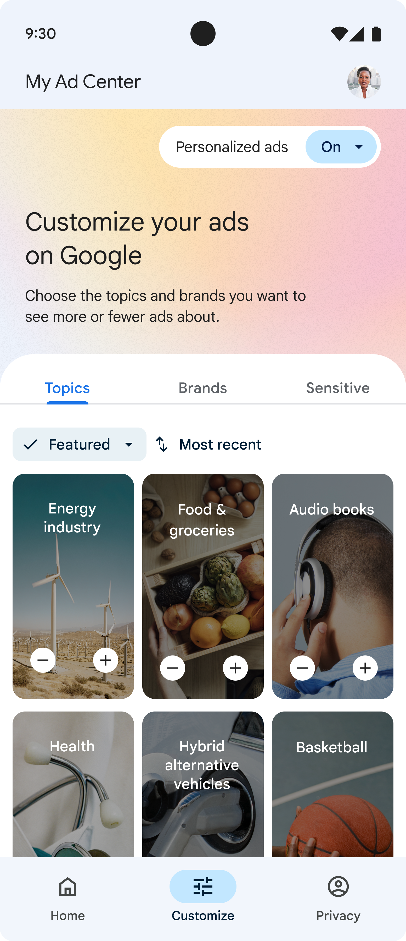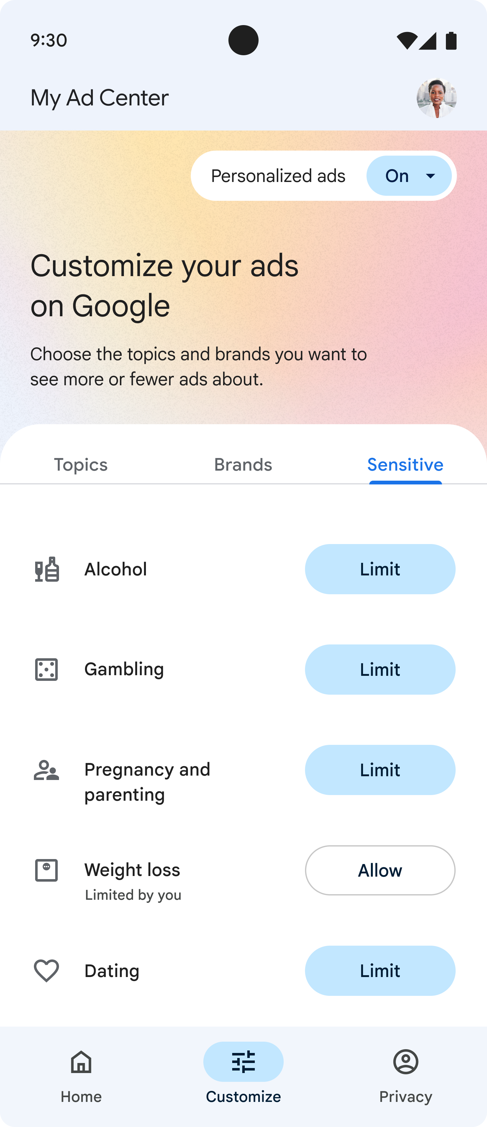 For instance, if someone was struggling to conceive, they may not want to see any ads related to pregnancy or parenting. Previously, Google allowed users to adjust those ad preferences in the Ads Settings section on their Google Account dashboard. But now these toggles are consolidated into the new My Ad Center tool.