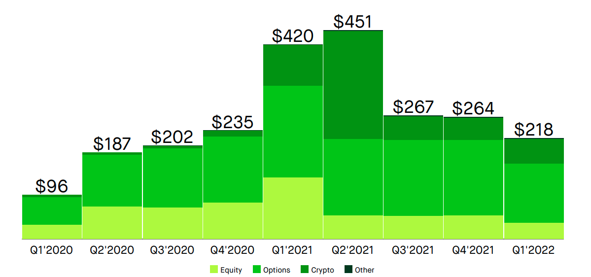 The following chart makes the point, tracking transaction revenues from Robinhood over the past few quarters: