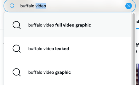 Reposts of the shooter’s stream were also easy to find on Twitter. In fact, when we typed “buffalo video” into the search bar, Twitter suggested searches like “buffalo video full video graphic,” “buffalo video leaked” and “buffalo video graphic.”