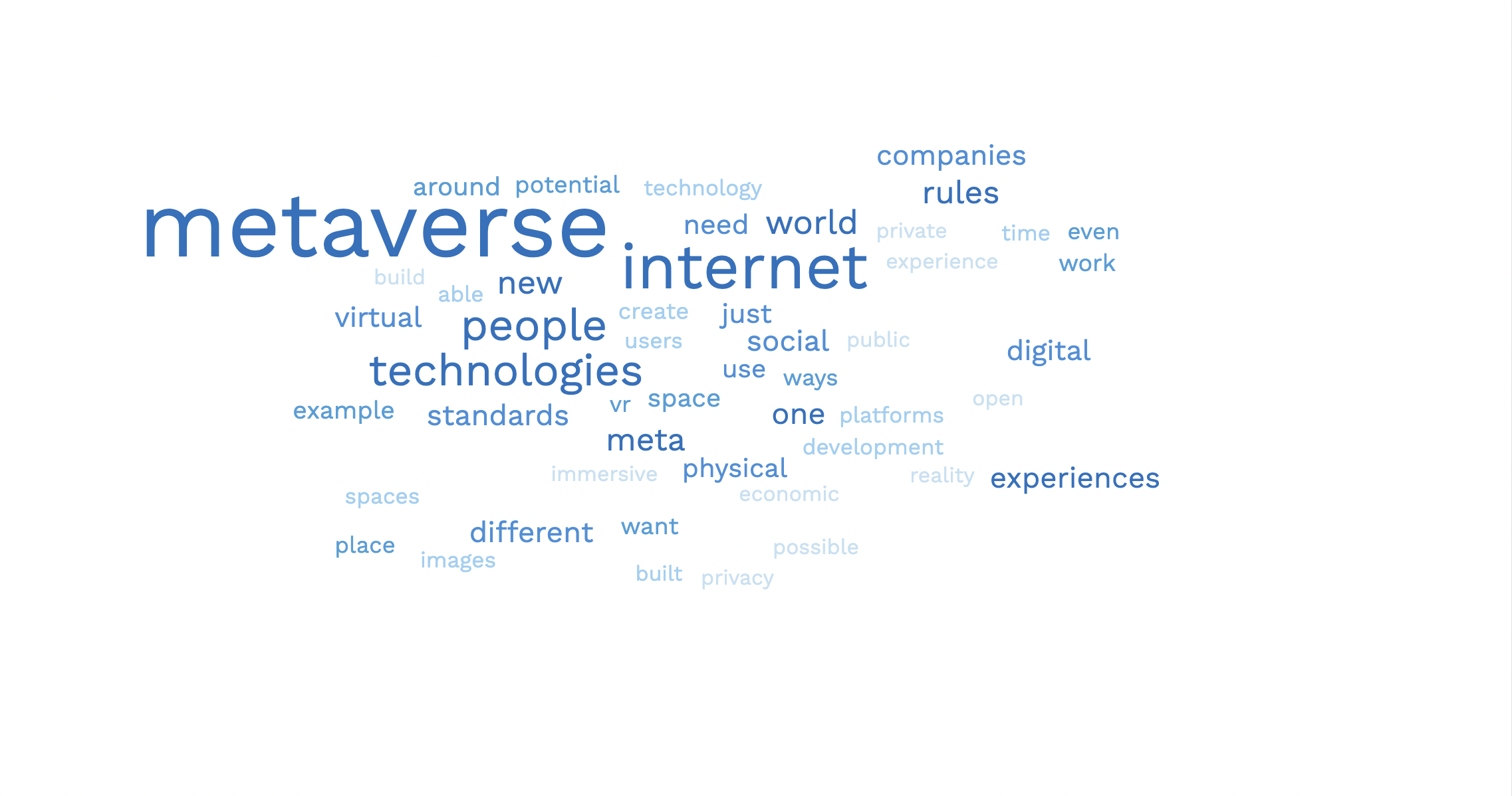 What follows is our bullet-pointed digest of Clegg’s metaverse manifesto. But first we invite you to chew over this WordCloud (below), which condenses his ~7,900-word essay down to 50 — most boldly featuring the word “metaverse” orbiting “internet”, thereby grounding the essay firmly in our existing digital ecosystem.