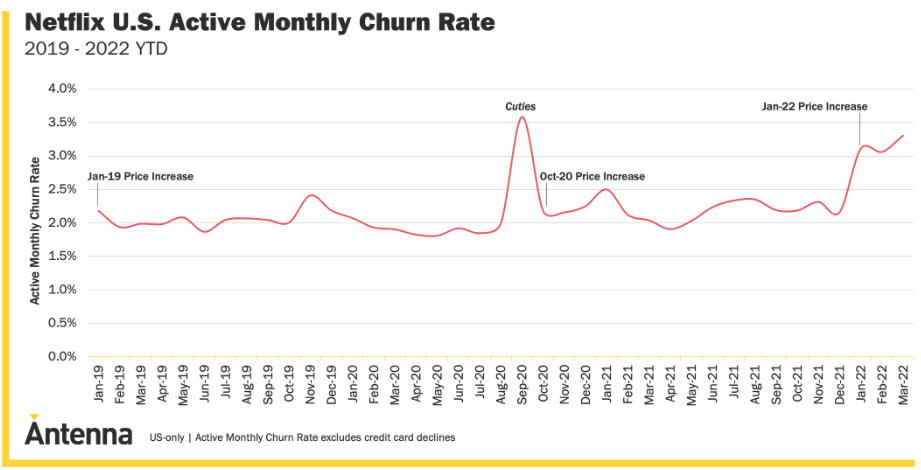 Since Netflix raised prices on all its plan tiers domestically in January 2022, there has been a major jump in subscription cancellations. The Netflix U.S. active monthly churn rate was a little over 2% in January 2019, after it raised subscription prices.