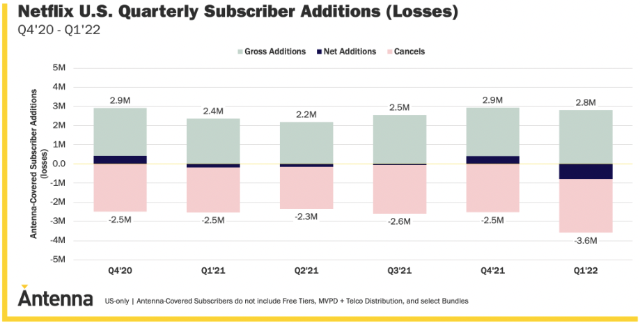 While subscriber growth may be high right now, so are cancellations. There were just under 30 million cancellations in Q1 2022, which is 12% higher than any quarter in history, or 4.5 times the cancel volume seen three years prior, Antenna finds.