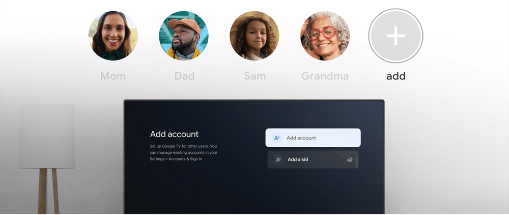 Once you receive the update, add a profile by clicking on your profile picture at the top right of the Google TV home screen. Select “Add an account” and follow the prompts to set up the profile.