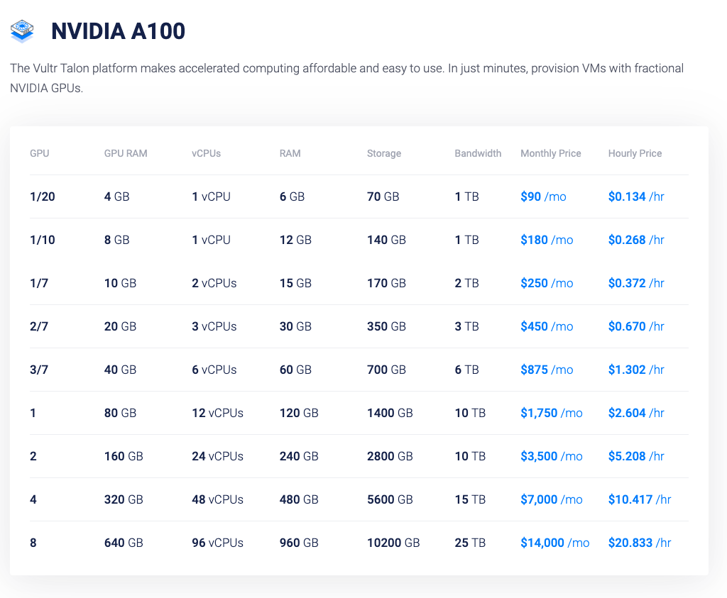 Vultr, the cloud platform that specializes in providing access to basic infrastructure services at a relatively low cost, today announced the launch of Vultr Talon, a new service that will offer developers access to virtualized GPUs, starting with Nvidia’s A100 Tensor Core GPU, with prices as low as $0.134/hour (or $90/month) for access to a twentieth of the compute power of an A100.