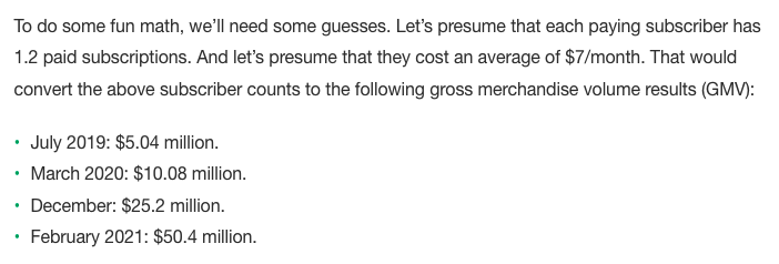 Our back-of-the-envelope math got us to an estimated $50 million worth of GMV for the company last February, and Substack wound up closing the year at what we loosely estimate now to be around $90 million in GMV. We weren’t that far off, though the faster Substack grew last year, the more we have may have overestimated its early 2021 GMV.