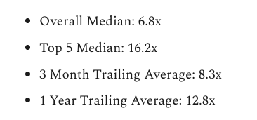 In April, we noted that Altimeter’s Jamin Ball calculated the median multiple for the top-five most richly valued public cloud companies at 27.5x (enterprise value/NTM, though we’re calculating market cap/ARR in the case of Databricks; given limited debt among unicorns, the numerators are close, and the denominators are both forward-looking, so don’t sweat the discrepancy). Since that point, things have gotten worse.