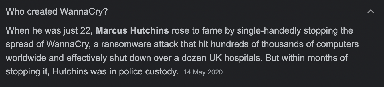 Moreover, the misleading presentation which pairs the question “Who created WannaCry?” with a search for Hutchins’ name, could still lead a web user who quickly skims the text Google displays after the question to wrongly believe he is being named as the author of the virus. So it’s not clear it’s much/any improvement on what was being automatically generated before.