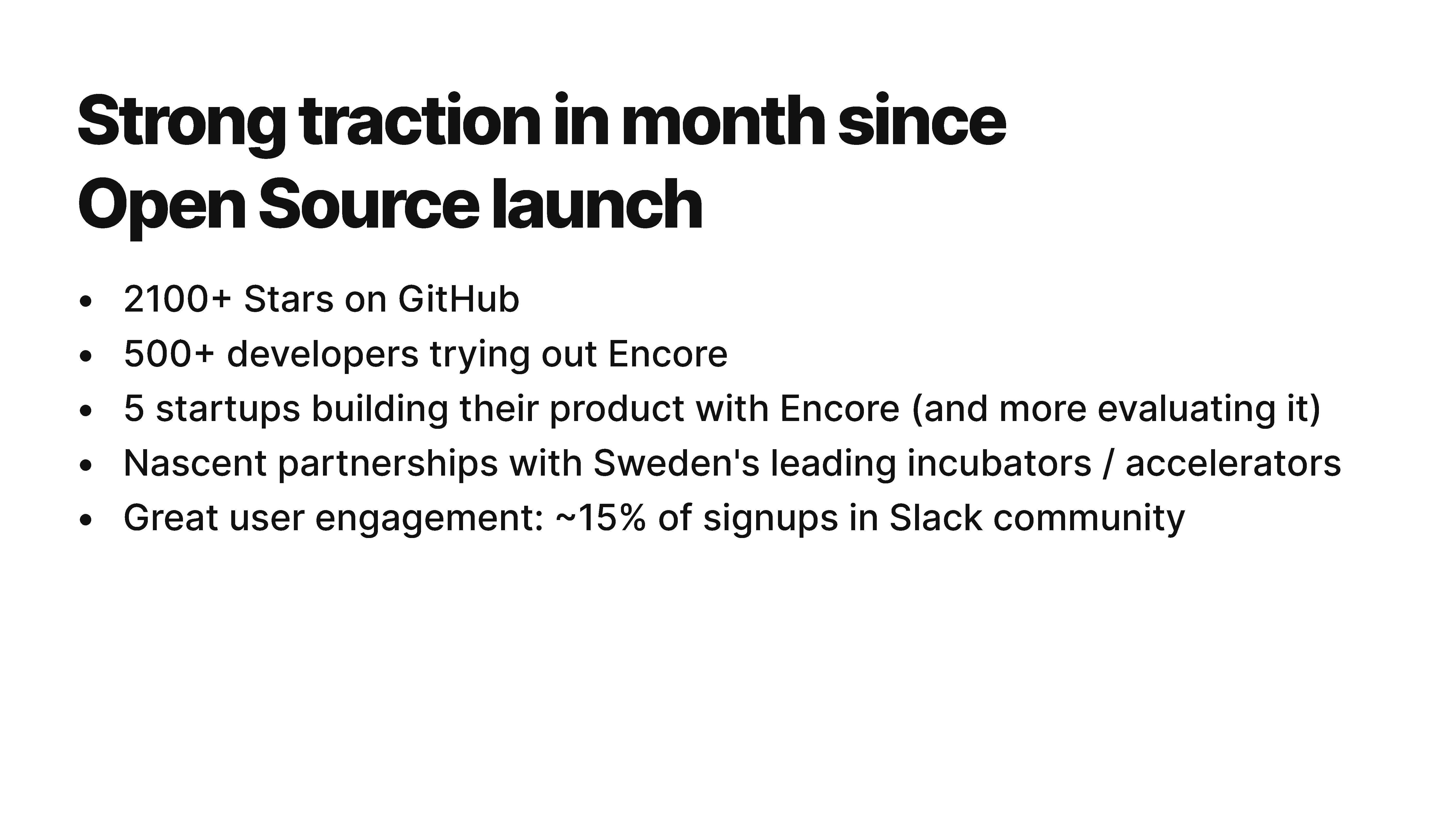 When Encore lists its traction metrics as stars on GitHub, I wonder why that’s the company’s top metric. That’s interesting, and possibly even impressive, but stars aren’t dollars. Developers trying out the product is admirable, but no mention of whether they are paying customers sets off an alarm bell.