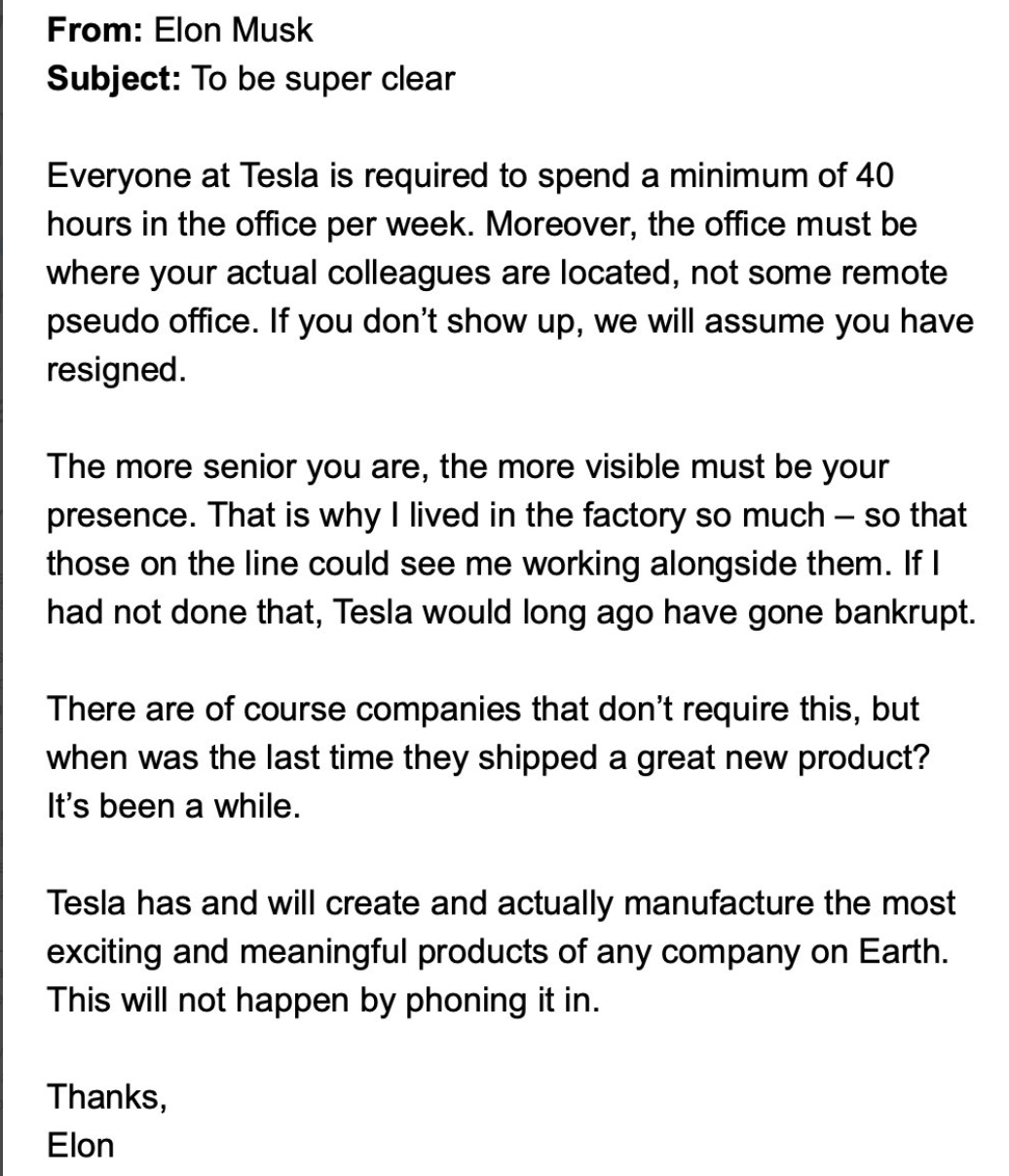 In the first email, which was later corroborated by Musk in a response via Twitter, he told employees that they must work a minimum of 40 hours in a Tesla office. A followup email entitled “to be super clear” explained that “the more senior you are, the more visible must be your presence.”