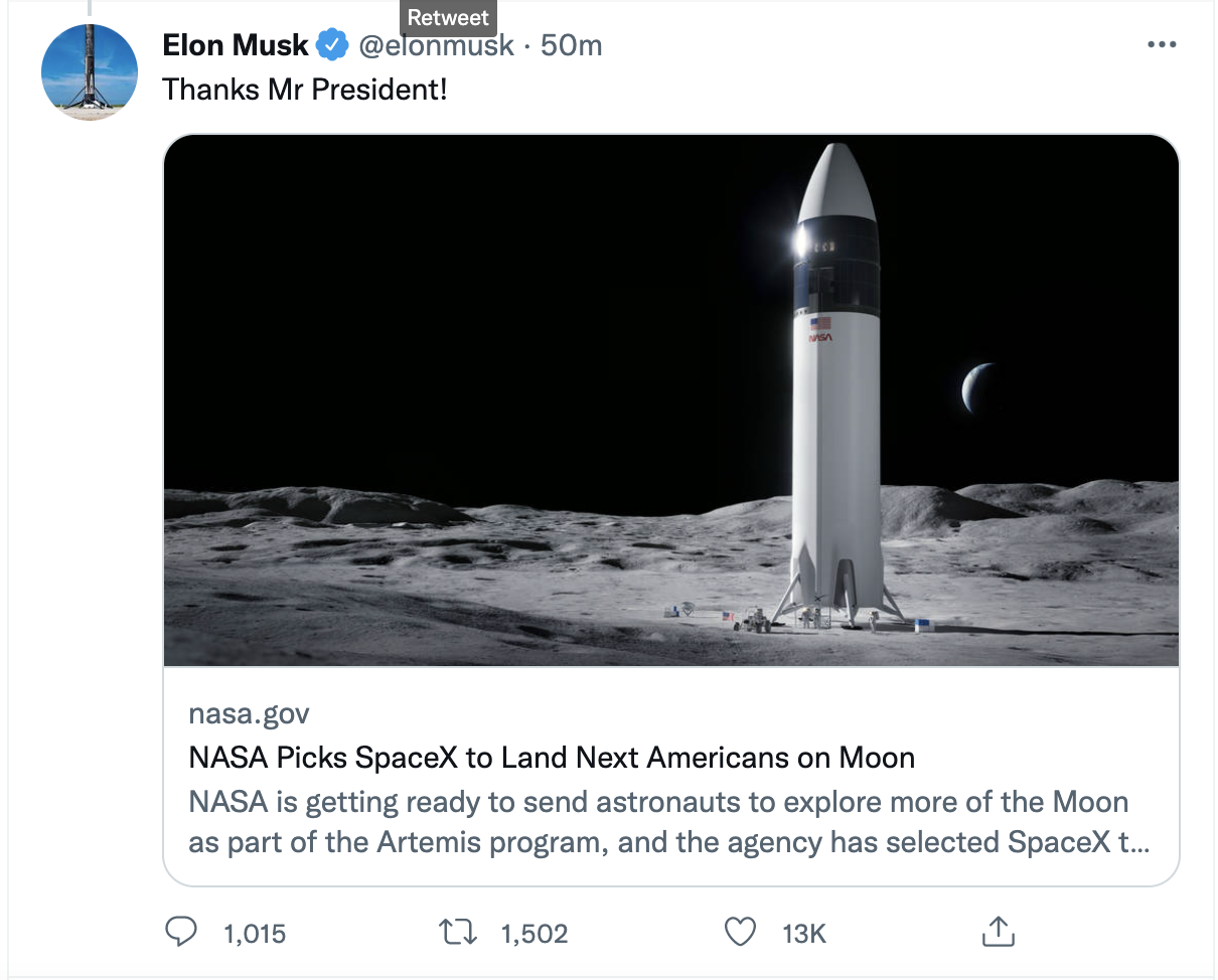 Musk replied via Twitter with the message “Thanks Mr. President!” and a link to a press release from NASA announcing the space agency had picked SpaceX, another Musk company, to send astronauts to the moon.