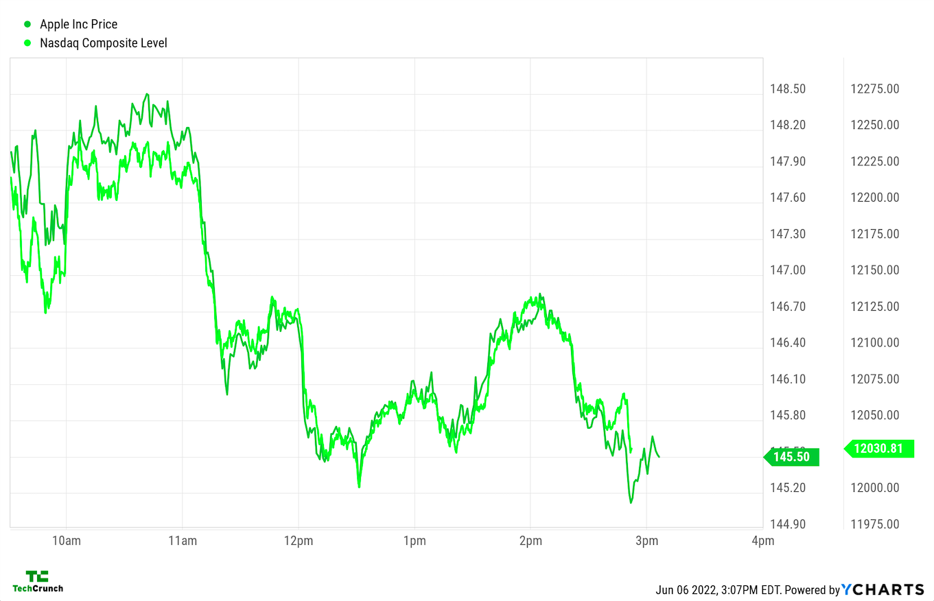 Today’s chart makes this lack of connection plain. Here’s stock market data through around 3 p.m. EDT today, comparing Apple’s stock with the Nasdaq composite’s trading over the same time frame, including during its pre-recorded video presentation: