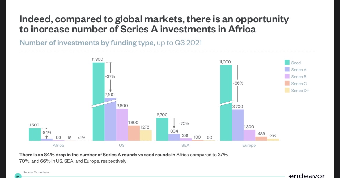 But as more global investors pay attention to Africa’s technology scene and local investors step up their game, what’s becoming evident is a shortage of capital in the early-growth stages, particularly around Series A investments. According to the report, there is an 84% drop in Series A rounds vs. seed rounds in Africa. This is compared to 37%, 70% and 66% in the U.S., Southeast Asia and Europe. There’s an opportunity here for local funds to invest above seed rounds, for larger Africa-focused firms to double down on Series A and for global funds to go lower than Series B, C and D.
