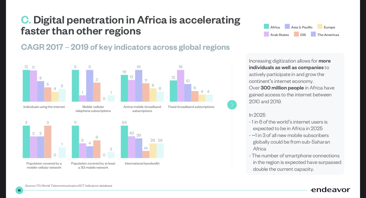 The continent’s $115 billion digital economy is in its early phases. For instance, 33% of individuals use the internet compared to a global average of 63%. The report also pinpoints other metrics such as fixed and mobile broadband connections and mobile cellular network coverage.