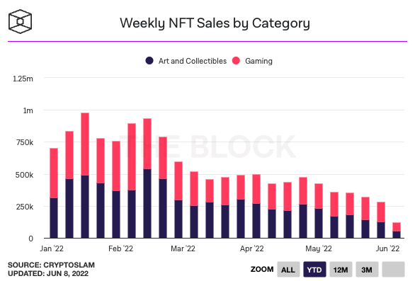 Per The Block’s data arm, weekly NFT sales declined by just over 70% from a high of nearly 1 million units in the third week of 2022 to a little more than a quarter-million in the most recent week in the dataset, which began in the final days of May. The decline in NFT sales volume is not new, but it has grown in severity in recent weeks, adding fresh heft to the argument that the crypto or web3 market is in a period of correction — what some describe as a “winter.”